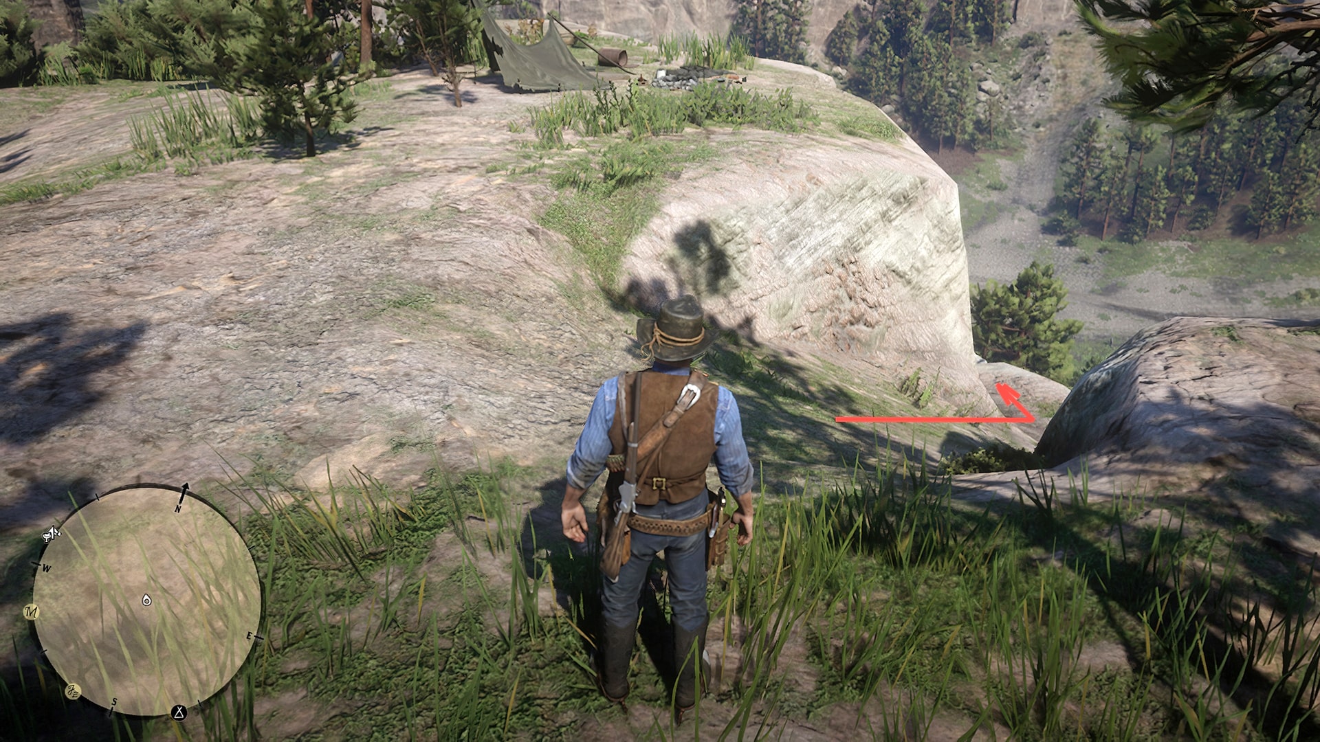 Чтобы добраться до следующей карты, найдите относительно легкий подъем и поднимитесь на гору. Маркер игрока на карте находится в начале подъема. Ищите палатку, а перед ней — спуск к небольшому выступу. Пройдите по нему до конца, чтобы найти следующую карту, спрятанную в скале. Будьте осторожны, так как вам нужно будет один раз прыгнуть, подтянуться, а затем снова спуститься на уступ.