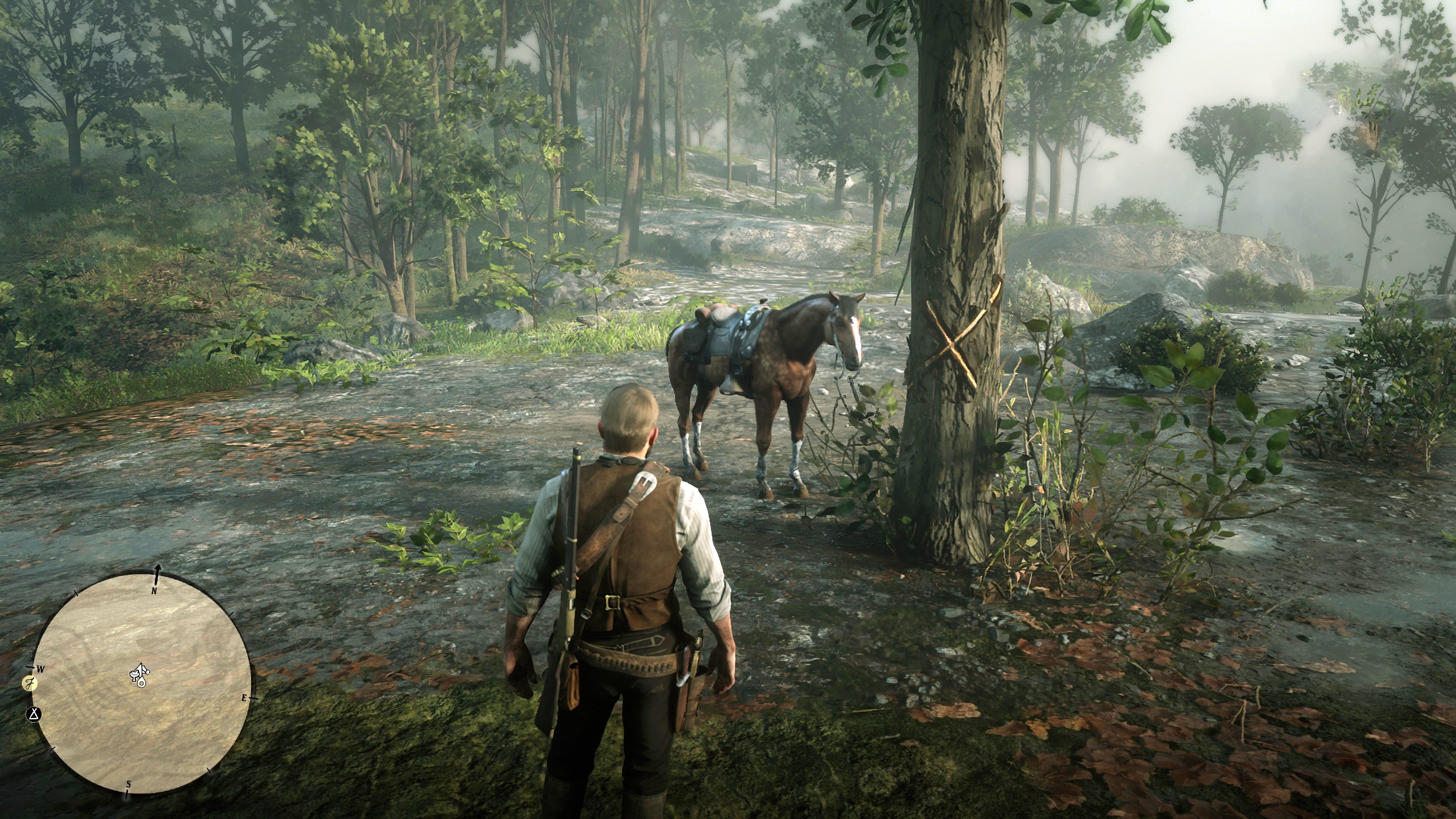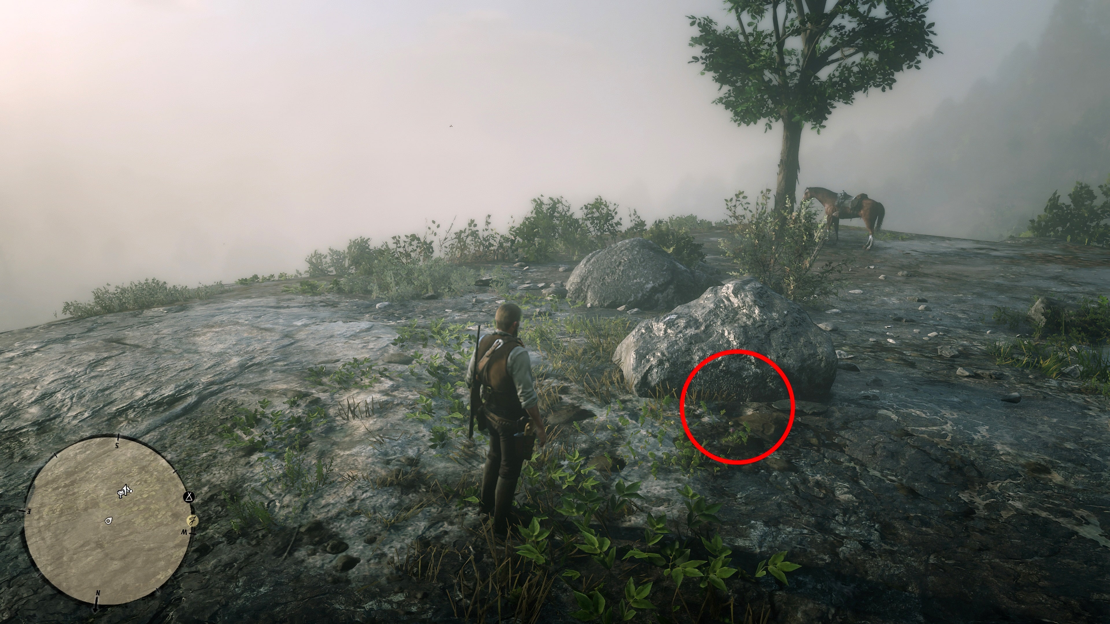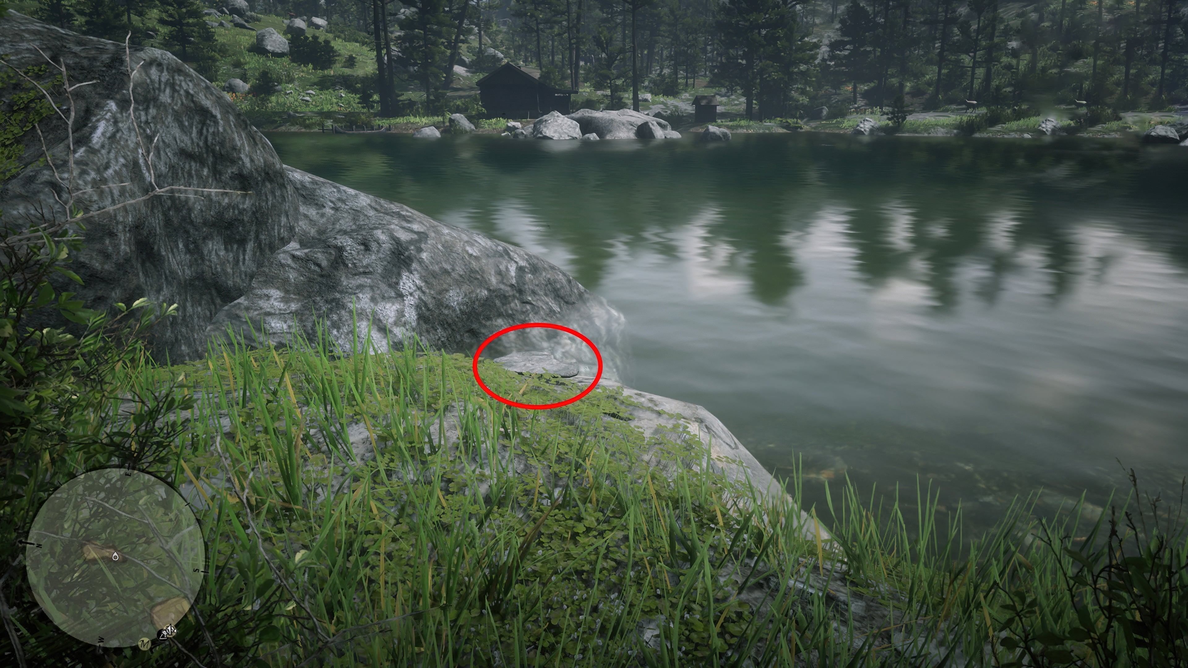 Сам клад можно найти к юго-западу от Аннесберга, возле озера Элизиан Пул. Ищите заметное дерево с вырезанной на нем буквой X, которую можно использовать в качестве ориентира (см. скриншот 2). Сокровище находится за вторым камнем рядом с деревом. У его основания можно поднять небольшой валун и найти небольшой слиток золота (см. снимок экрана 3).