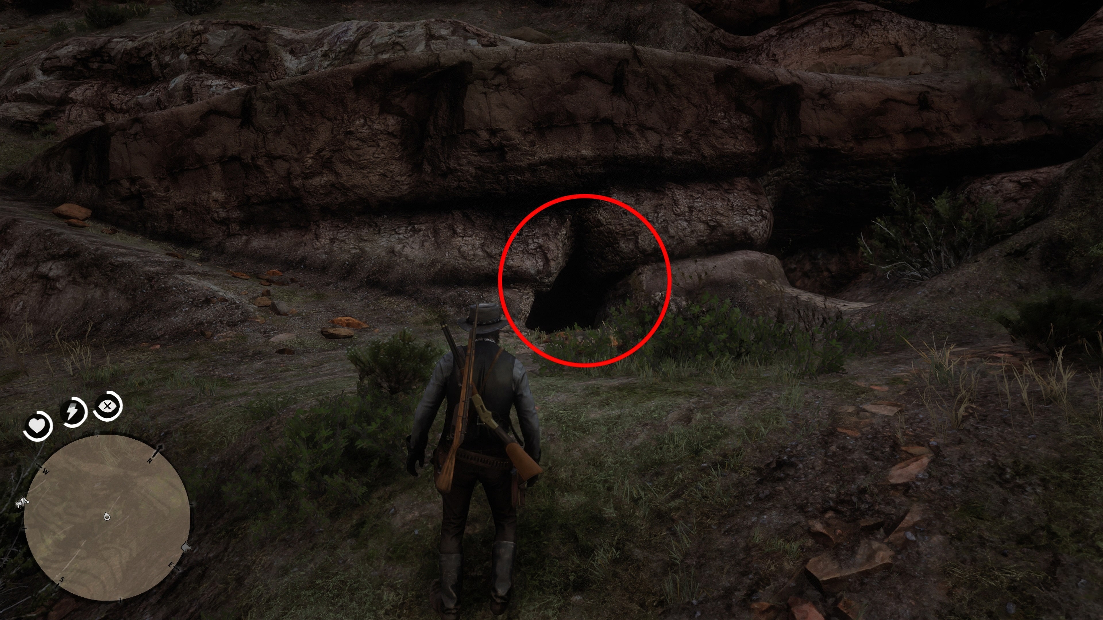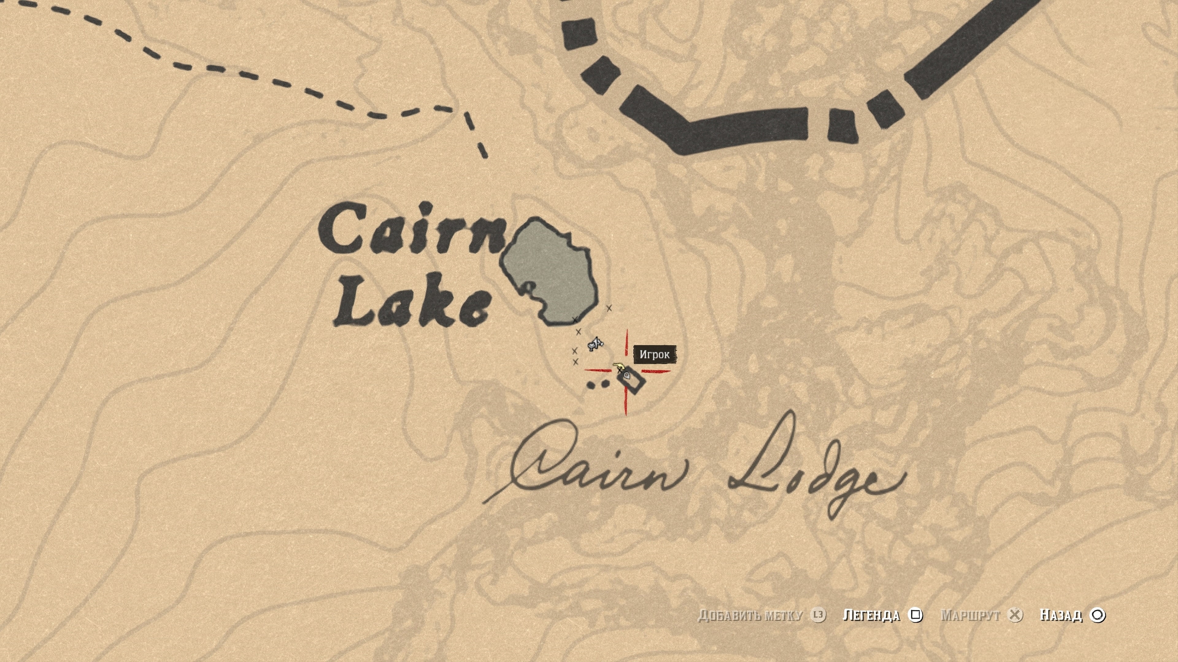 Третий тайник будет труднее всего найти, он находится в горах к северу от Форта Уоллес. Если вы уже искали наскальные рисунки в этом районе, вам будет проще проследить за своими действиями. Маркер игрока на скриншоте находится в том месте, откуда удобно начать подъем на гору, а красный маркер указывает примерное направление.