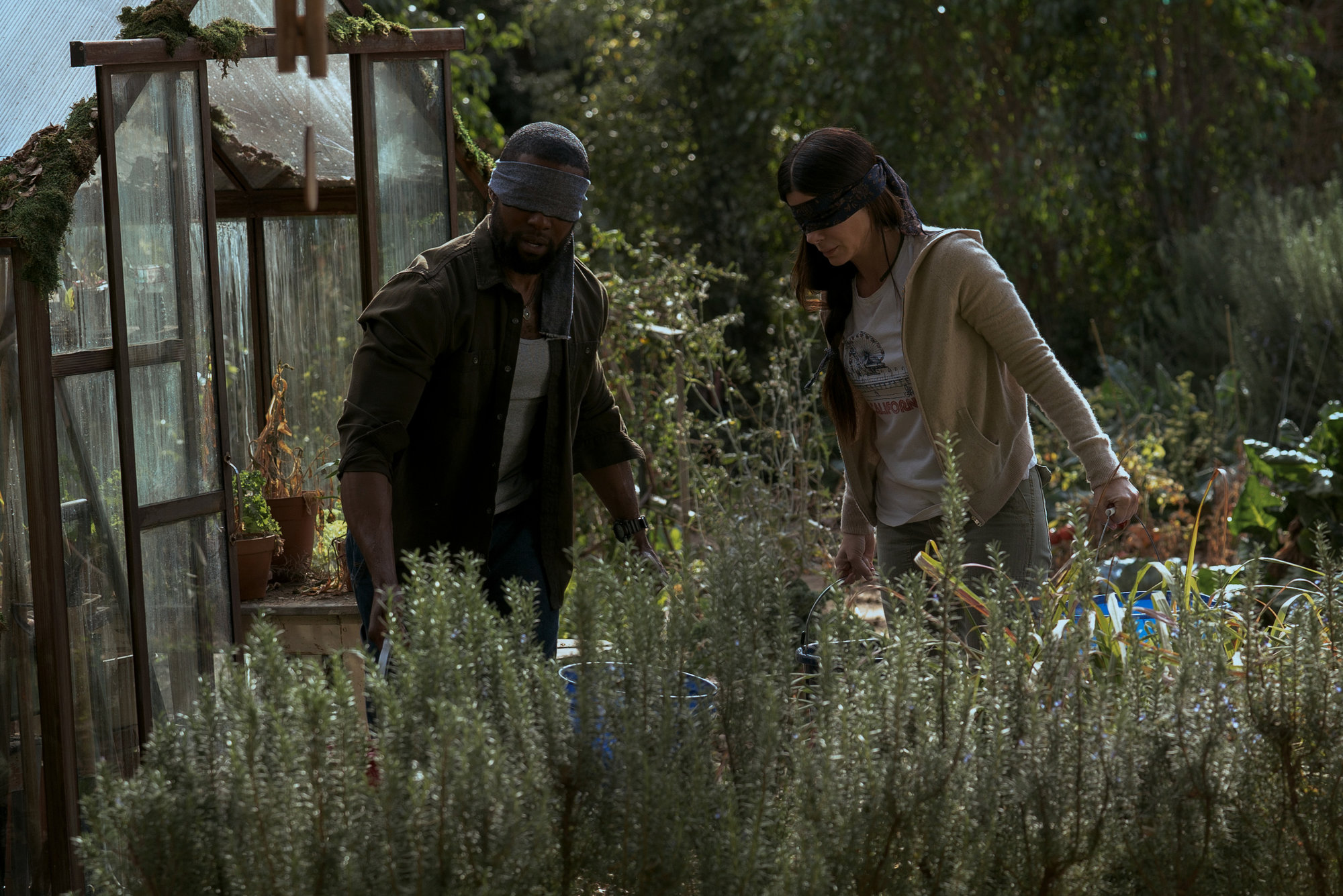 Смертельный феномен — увидев на улице нечто, люди мгновенно сходят с ума и заканчивают жизнь самоубийством. В Bird Box планету подобно стихийной эпидемии захлестнула волна суицидов, выжить удалось только тем, кто успел спрятаться в помещении. В центре сюжета девушка по имени Мэлори (Сандра Буллок) и повествовательная структура ее путешествия разделена на две части. В первой она с двумя детьми бродит по лесу с завязанными глазами и старается добраться в некое безопасное место. Действие второй разворачивается на пару лет раньше и зрителю дают посмотреть, как все начиналось. Беременная Мэлори оказывается заперта в доме с несколькими случайными людьми, каждый из которых почти карикатурный персонаж, типичный архетип героя ужастика. В замкнутом пространстве с девушкой остались агрессивный старик (Джон Малкович), гик, панк, другая беременная дама и еще пара человек. Новообразованной группе предстоит разобраться, что случилось, как выжить и найти способ добывать пищу.