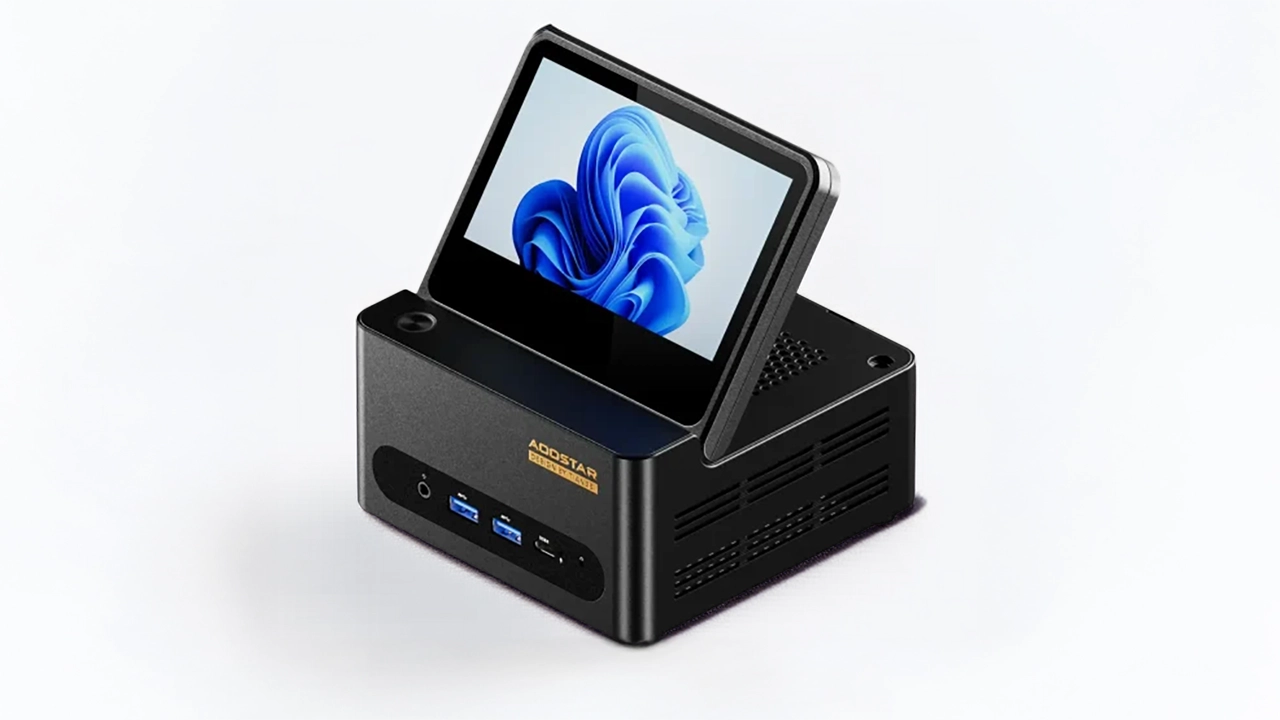 AOOSTAR G-Flip — необычный мини-ПК, анонсирован в марте 2025 года. Его главная особенность — встроенный 5,5-дюймовый дисплей, который можно поднимать под углом до 90° или складывать вровень с корпусом. Интересная, хотя и не самя практичная задумка. Тем не менее, экран позволяет выводить системные уведомления, мониторить рабочий чат и менять настройки без внешнего монитора. А еще — нескучные обои!