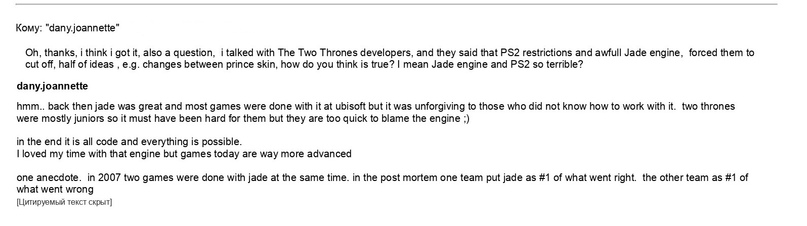 Geva: О, спасибо, я думаю, что понял. Тогда вопрос, я выяснял насчёт с T2T, и они сказали, что ограничения PS2 и движок Jade заставили их срезать часть идей, например, переключение между Принцами. Как вы думаете, это правда? Я имею в виду Jade engine и PS2 действительно столь трудны?
