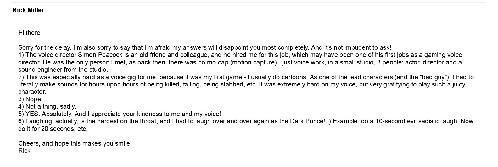 Miller: Приветствую. Я помню, что очень наслаждался процессом записи и играл Тёмного Принца. Это было изнурительно, но я рад, что это сделало так много людей счастливыми!