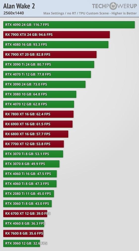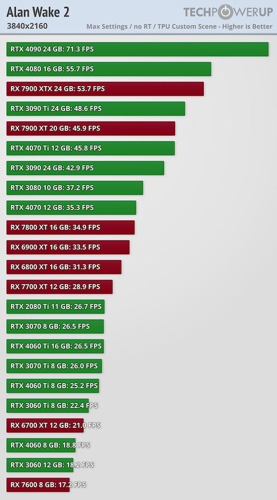 26 октября 2023 года спало эмбарго на публикацию обзоров Alan Wake 2, после чего в сети появились результаты тестирования игры на ПК и консолях. В издании TechPowerUp оценили производительность survival-хоррора с максимальными настройками графиками на 23 видеокартах.