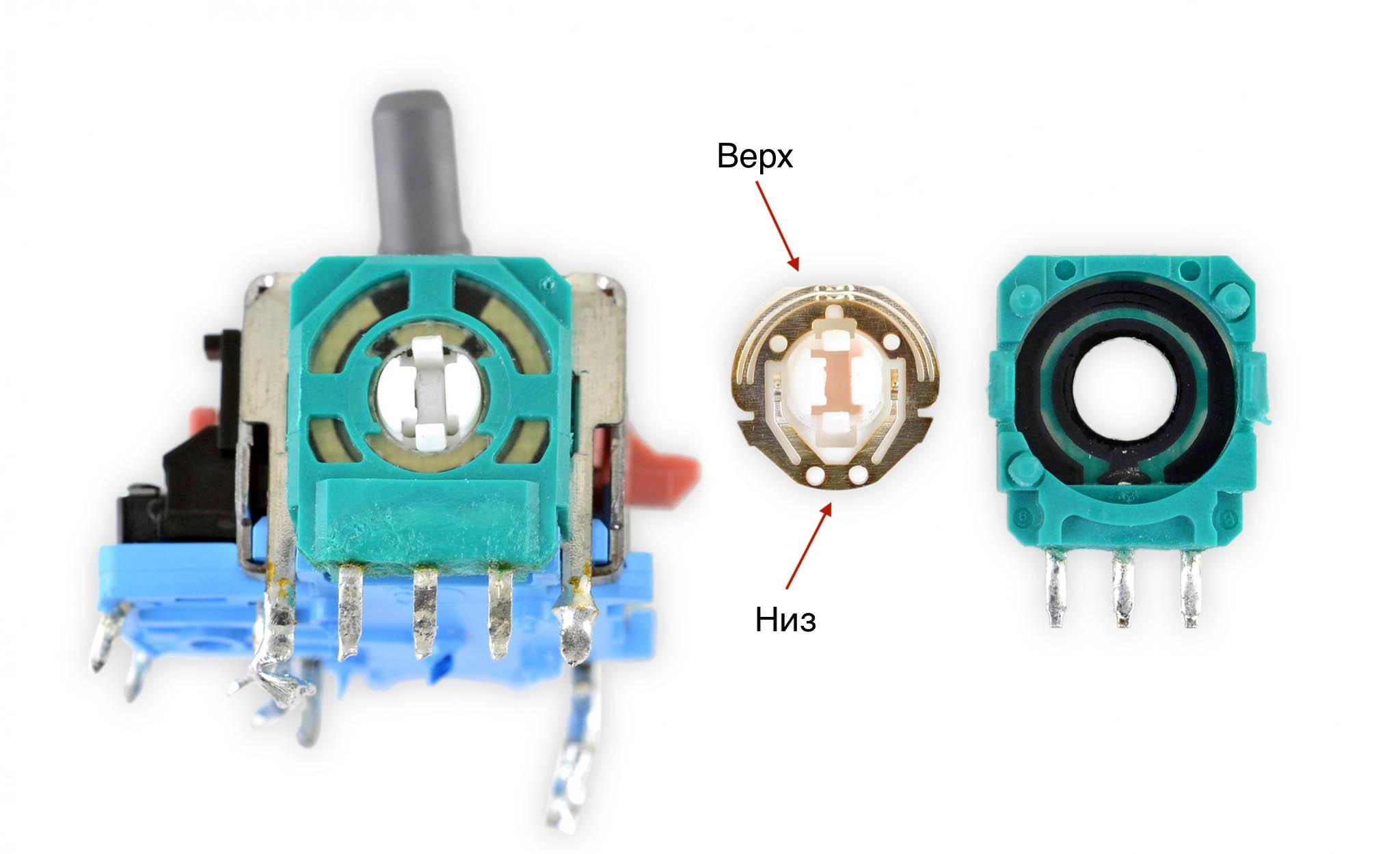 По бокам механизма, на осях, крепятся потенциометры, состоящие из бегунка и пластикового основания с тремя ножками. Внутри основания потенциометра нанесен графитовый слой. Слой резистивный, имеет два контура: внешний и внутренний. нешний контур соединен с левой и правой ножками основания, а внутренний — со средней ножкой. Такая конструкция основания позволяет измерять сопротивление на каждом из контуров и отслеживать его изменение. Бегунок имеет три лапки, которые перемещаются по графитовому слою обоих контуров, изменяя их сопротивление. Постоянное измерение изменяющихся значений сопротивления аппаратной частью контроллера позволяет преобразовать механическое движение стика в нужные команды управления.