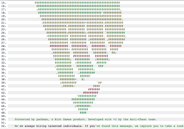 “Protected by packman, a Riot Games product. Developed with <3 by the anti-cheat team. we’re always hiring talented individuals. if you’ve found this message, we implore you to take a look at our jobs page and see anything catches your interest: https:>